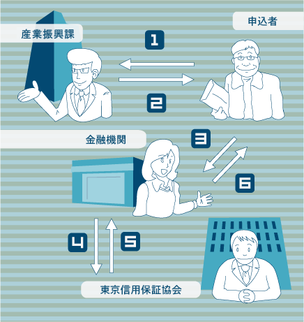 ⑤東京信用保証協会はこれを審査し、保証決定後、保証書を金融機関へ送付します。なお初回申込みの場合、東京信用保証協会担当者が申込者の事業所にうかがいます。
