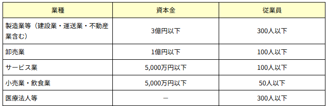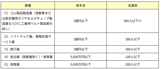 ※NPO法人の場合、ゴム製品製造業(自動車または航空機用タイヤ及びチューブ製造業並びに工業用ベルト製造業を除く)は、従業員数300人以下、旅館業は同100人以下となります。
