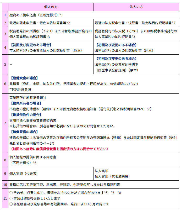 ・環境改善資金、ワークライフバランス資金をお申込みの場合、所管から交付された認定書をお持ちください。