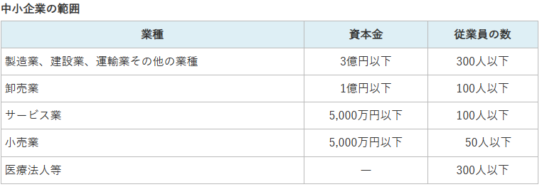 (1)中小企業者であること(資本金又は常時使用する従業員数のいずれか一方が以下に該当していること)。ただし、「小口零細企業保証制度」の適用を受ける「小口資金」枠を利用する場合は、常時使用する従業員数が20人(卸売・小売・サービス業は5人)以下であること。