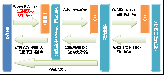 この融資制度は、江戸川区が事業主に直接融資するものではなく、江戸川区と融資取扱契約を結んだ金融機関が、信用保証協会の保証を得て融資する制度です。