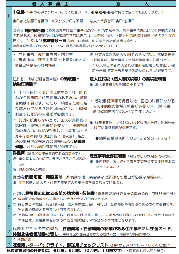 ②法人は登記上の本店所在地が 1年以上前から練馬区内にあり、個人事業主は主たる事業所所在地または住所が1年以上前から練馬区内にあること。また、法人・個人事業主とも同一事業を引き続き1年以上営んでいること。