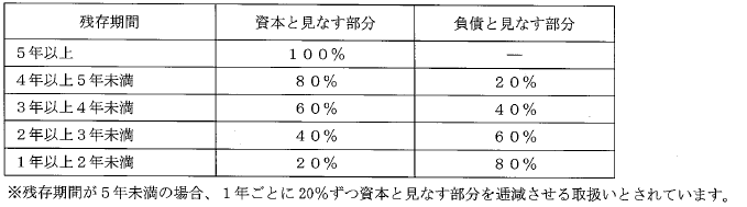 ※残存期間が5年未満となった債務については、1年ごとに20%ずつみなし自己資本の割合が逓減します。