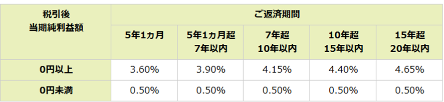 融資後1年ごとに、直近の業績に応じて、ごv返済期間ごとに次の2区分の利率が適用されます。