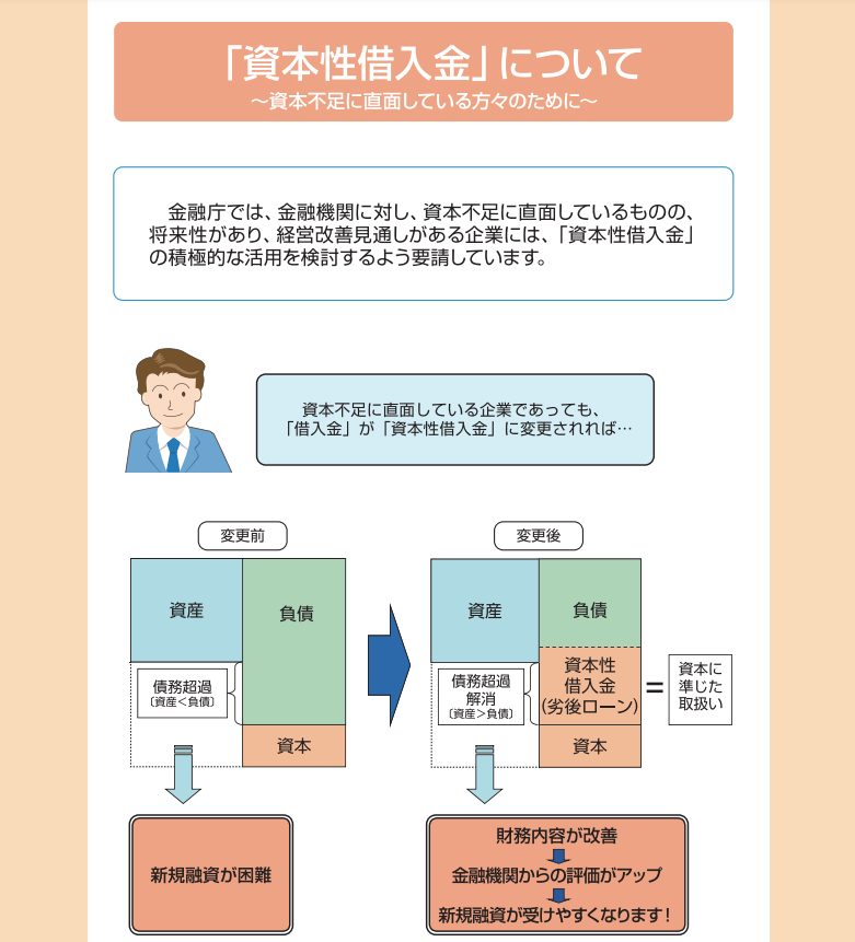 資本性劣後ローンは、法的倒産時の返済順位の劣後性により、金融機関からは資本とみなされることで財務安定化が図られ、金融機関からのご融資が受けやすくなります。