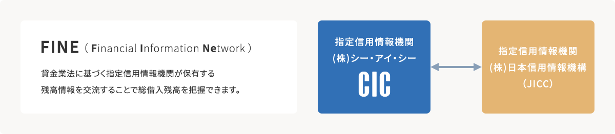 FINE(Financial Information Network)とは、貸金業法の指定信用情報機関制度に基づき、指定信用情報機関である株式会社CICおよび株式会社日本信用情報機構のニ機関間で行っている交流ネットワークです。
