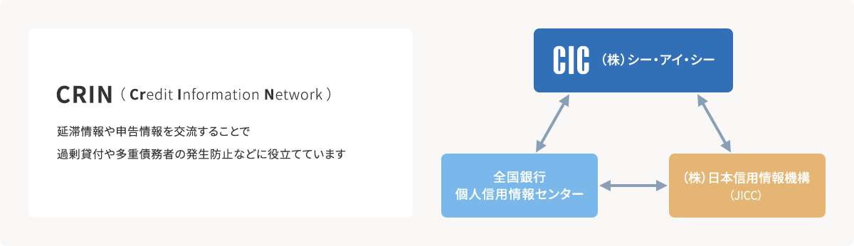 CRIN(Credit Information Network)とは、株式会社CICおよび全国銀行個人信用情報センター、株式会社日本信用情報機構の三機関間で行っている交流ネットワークです。