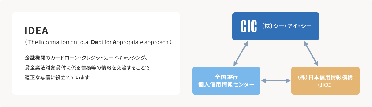 IDEA(The Information on total Debt for Appropriate approach)とは、当社および全国銀行個人信用情報センター、株式会社日本信用情報機構の三機関間で行っている交流ネットワークです。