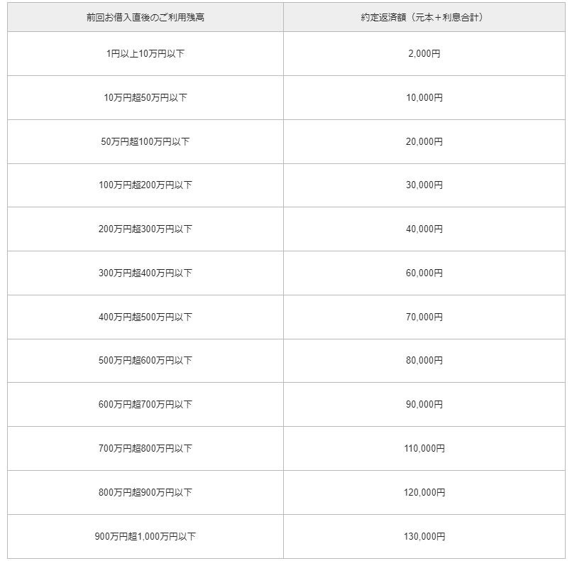 ・借入残高0円の状態でお借り入れをした場合、借入日を含む20日以内に到来する約定返済日はスキップされ、1ヶ月先の返済日から返済開始となります。なお、返済日のスキップ等によって利息額が約定返済額を超えた場合、その利息額が約定返済額になりますので、ご注意ください。